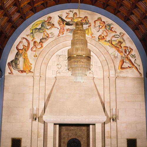 Muurschildering met musicerende klassieke figuren