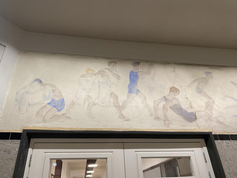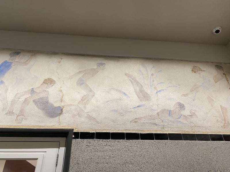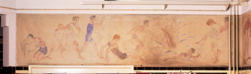 Op deze figuratieve voorstelling zijn figuren afgebeeld die in het water springen, zwemmen of zich lijken te haasten om ook in het water te springen.