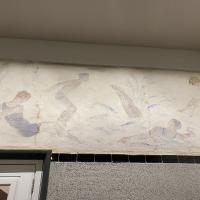 Er zitten twee verticale bruine vlekken op het midden van de schildering, in de linkerhoek zit een bredere verticale bruine vlek. En op de gehele bovenzijde zit een bruine aanslag.
