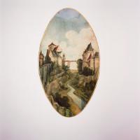 - nl Rots-en rivierlandschap met aan weerszijden kasteelachtige bouwwerken