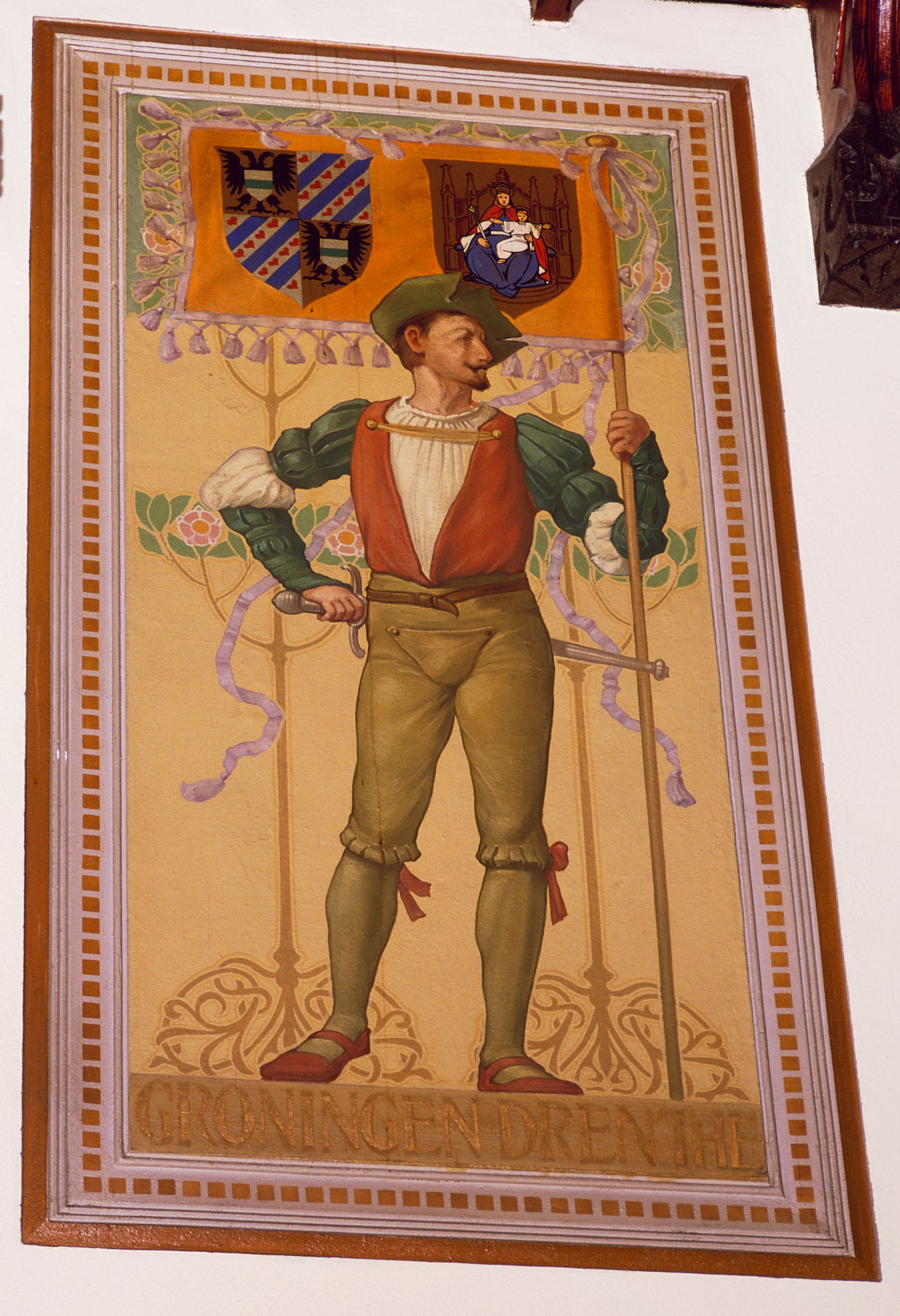 Schutter met vaandel voorzien van de wapens van de provincies Groningen en Drenthe