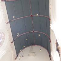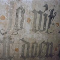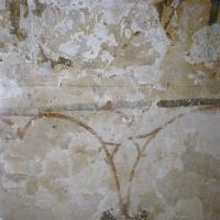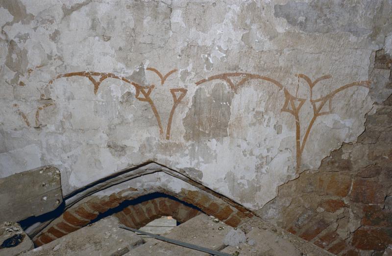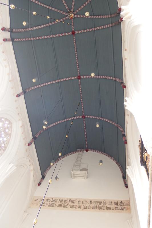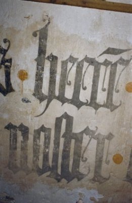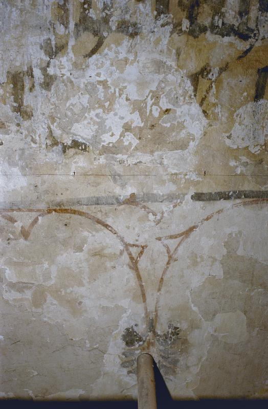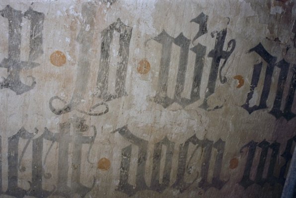 - Muurschilderingen, een decoratiepatroon, koor, hoog, op rand onder houten gewelf en tekst op muur.