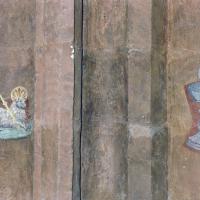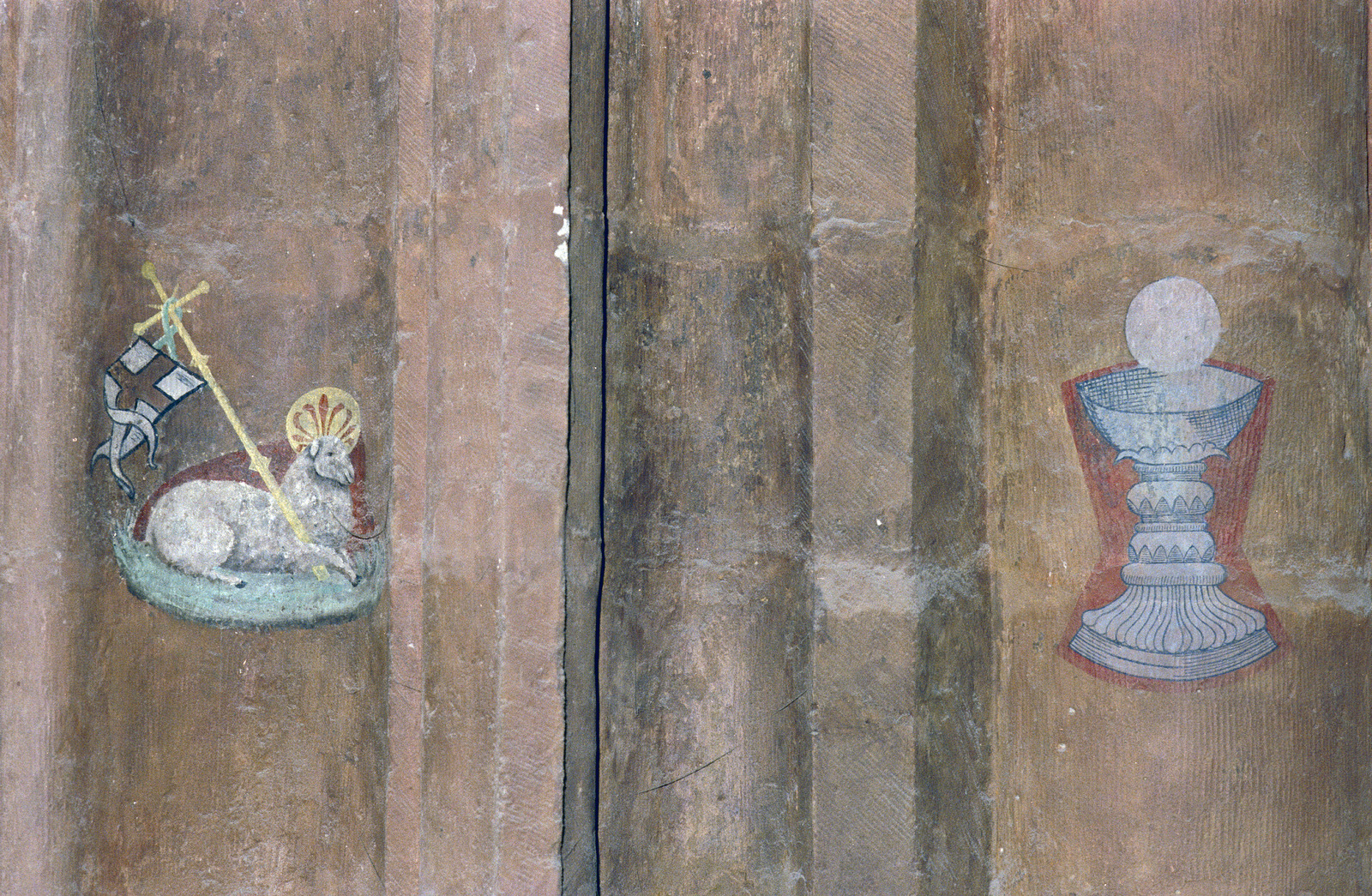 - Een vieringspijler met kelken, hosties en het Lam Gods met kruisvaan. Deze schildering vormde in de 16de eeuw de achtergrond van een sacramentshuis.