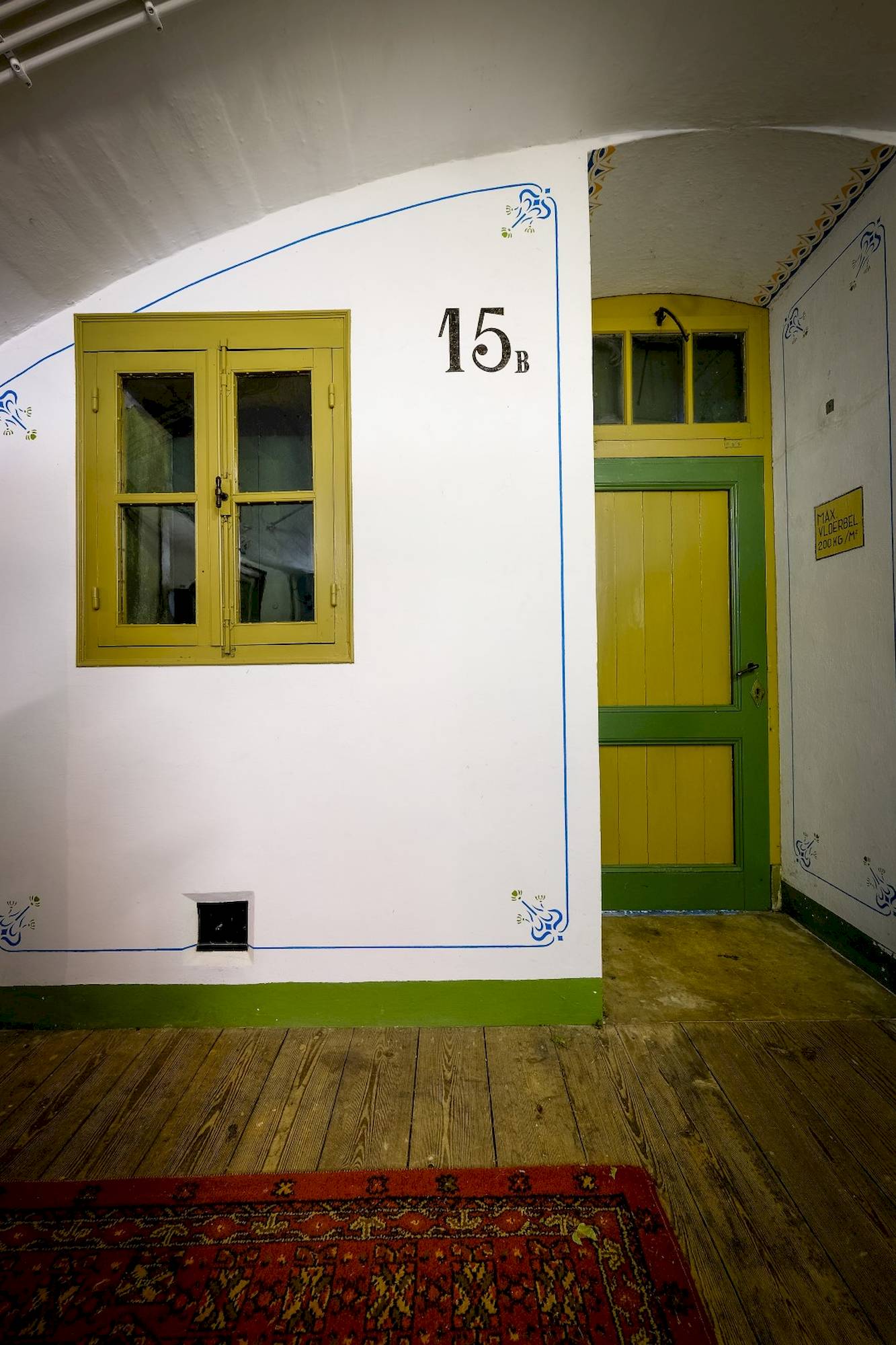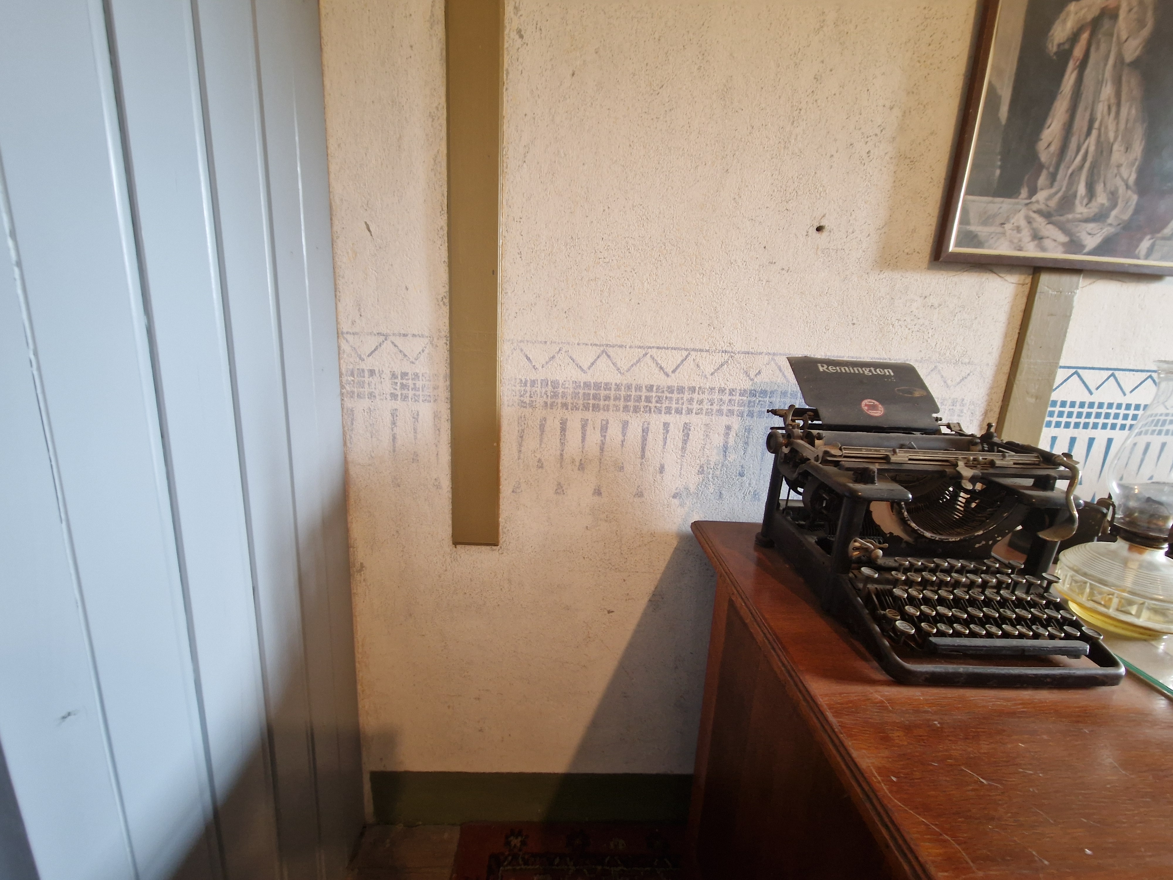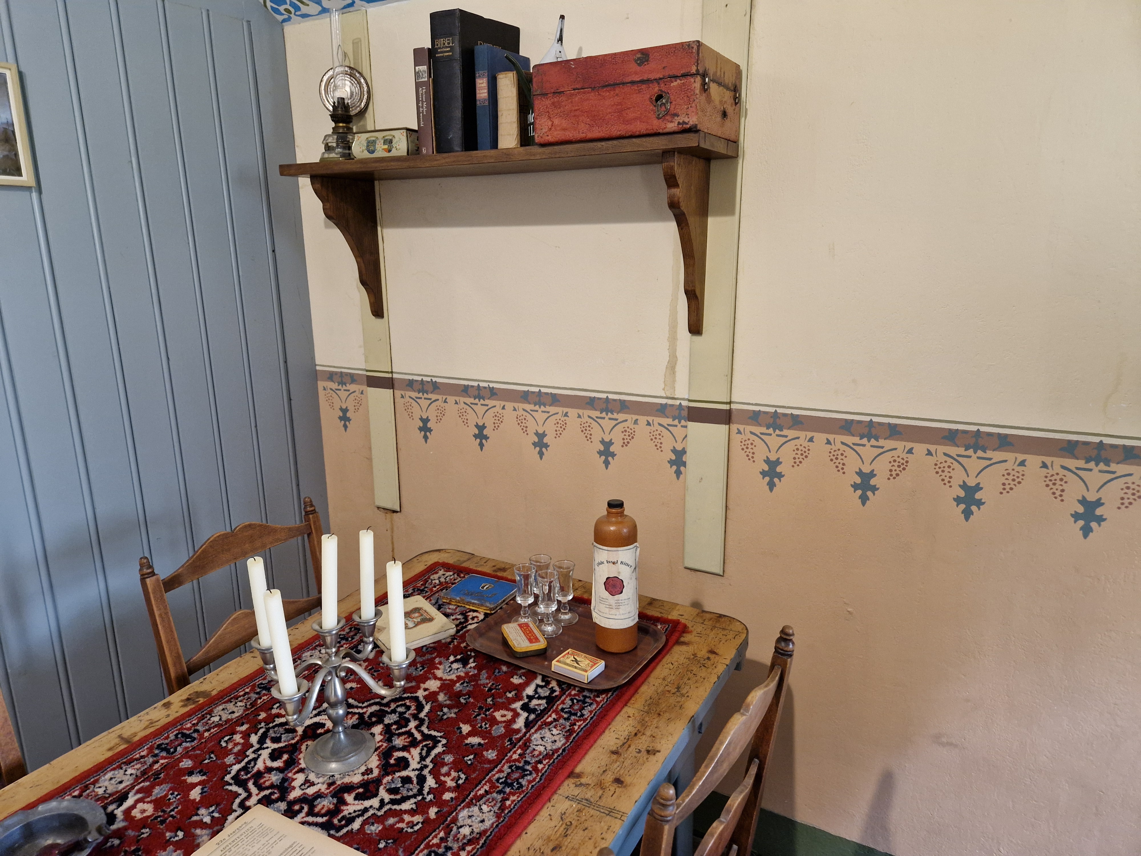 Lambrisering, kamernummers en kamernamen. Schilderingen gerestaureerd door vrijwilligers. In kamer 15b nog een originele lambrisering van 130 breed en 40 cm hoog.