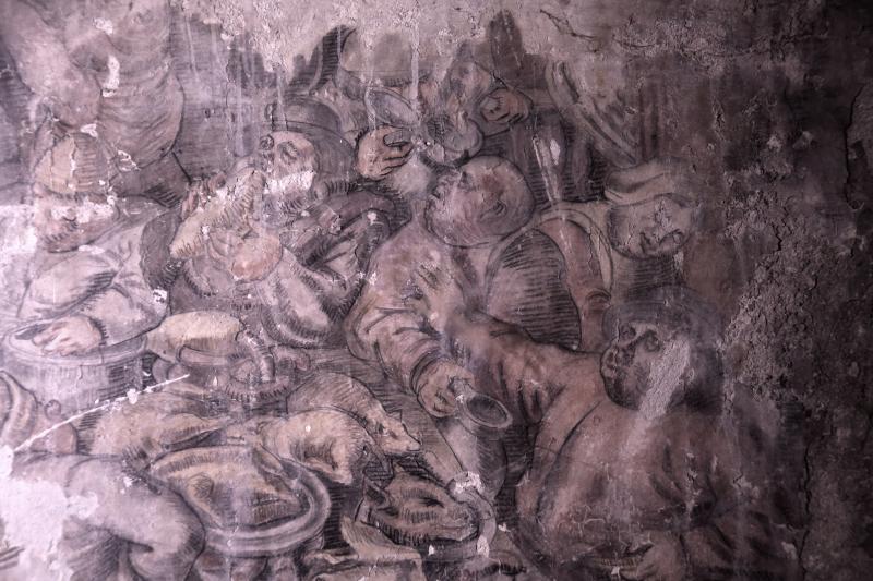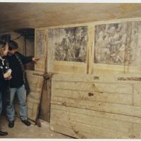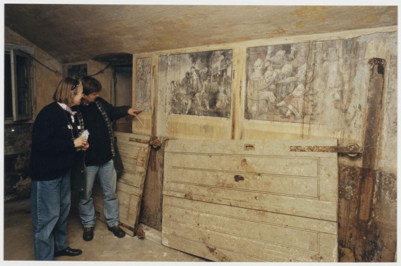 Twee wanden zijn beschilderd met kopieën van schilderijen uit het Rijksmuseum en twee decoratieve stroken. Drie voorstellingen van schilderijen van Jan Steen, een schilderij van Adriaan Brouwer, een van Pieter Brueghel en van Pieter Aertsen. Twee kopieën zijn te beschadigd om te zien wat is afgebeeld. Ter bescherming zijn plastic voorplaten aangebracht.