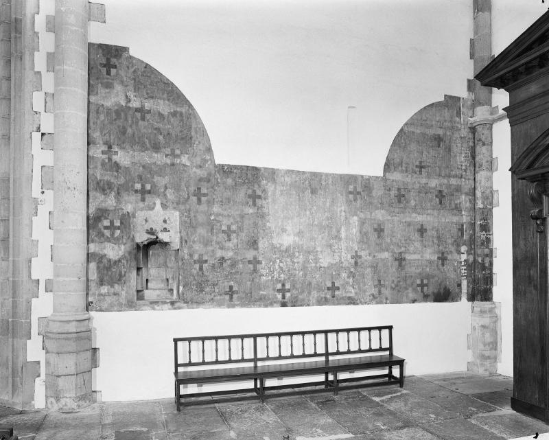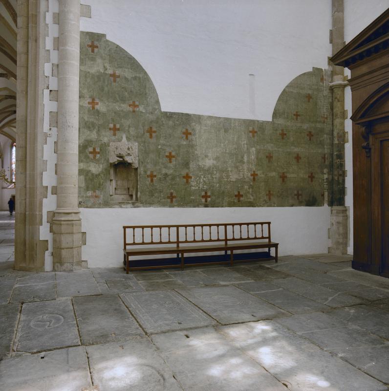 - Interieur oostmuur, wandschildering met wapens