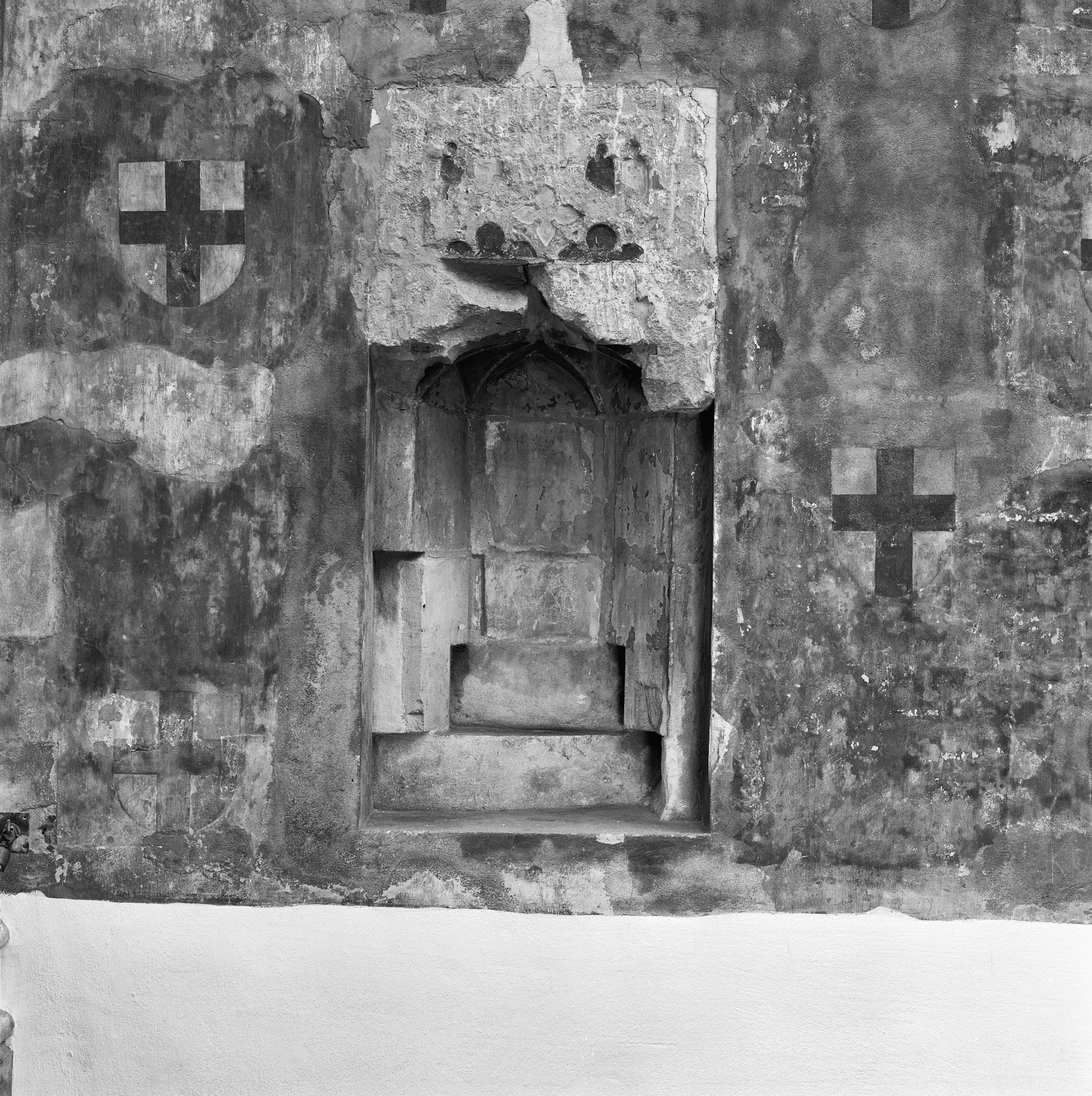 Interieur oostmuur, wandschildering met wapens
