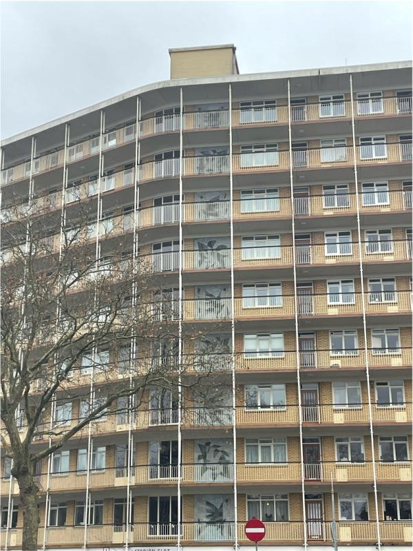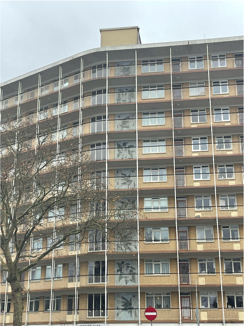 Negen muurschilderingen op elk van de galerijen van de Stadionflat. Een van de schilderingen is gerestaureerd (zie artikel). De schilderingen zijn zo aangebracht dat ze van een afstand op een mozaïek lijken.