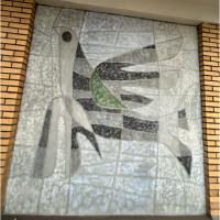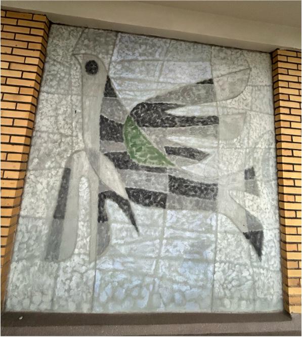 Op elke verdieping van het gebouw, buiten op de galerij, is een muurschildering gemaakt. Deze begint op de eerste verdieping tot en met de negende verdieping. De muurschilderingen verbeelden 5 gestileerde vogels, lijkend op duiven, en 4 afbeeldingen van iets dat op een blad lijkt of ander soort geabstraheerd organisch element. Over de negen muurschilderingen zijn slechts deze twee verschillende composities te zien, die elkaar elke verdiepingen afwisselen en steeds gespiegeld worden.