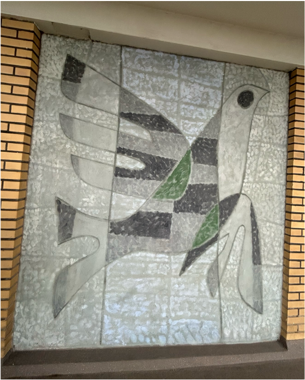 Op elke verdieping van het gebouw, buiten op de galerij, is een muurschildering gemaakt. Deze begint op de eerste verdieping tot en met de negende verdieping. De muurschilderingen verbeelden 5 gestileerde vogels, lijkend op duiven, en 4 afbeeldingen van iets dat op een blad lijkt of ander soort geabstraheerd organisch element. Over de negen muurschilderingen zijn slechts deze twee verschillende composities te zien, die elkaar elke verdiepingen afwisselen en steeds gespiegeld worden.