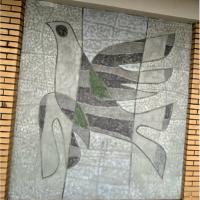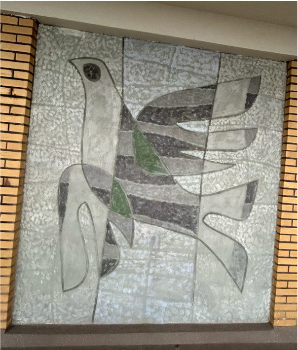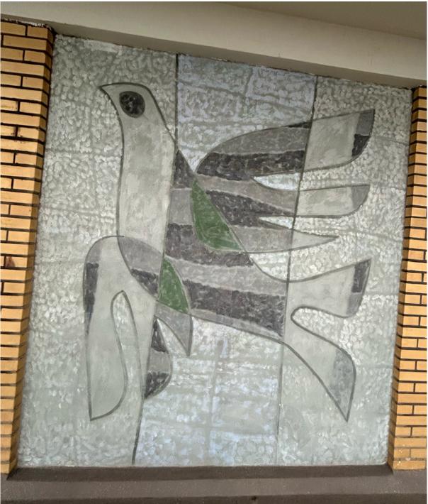 Op elke verdieping van het gebouw, buiten op de galerij, is een muurschildering gemaakt. Deze begint op de eerste verdieping tot en met de negende verdieping. De muurschilderingen verbeelden 5 gestileerde vogels, lijkend op duiven, en 4 afbeeldingen van iets dat op een blad lijkt of ander soort geabstraheerd organisch element. Over de negen muurschilderingen zijn slechts deze twee verschillende composities te zien, die elkaar elke verdiepingen afwisselen en steeds gespiegeld worden.