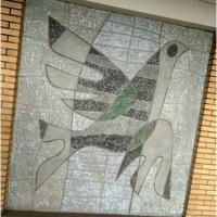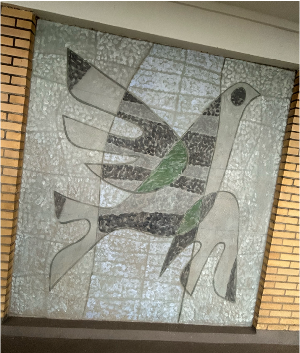 Op elke verdieping van het gebouw, buiten op de galerij, is een muurschildering gemaakt. Deze begint op de eerste verdieping tot en met de negende verdieping. De muurschilderingen verbeelden 5 gestileerde vogels, lijkend op duiven, en 4 afbeeldingen van iets dat op een blad lijkt of ander soort geabstraheerd organisch element. Over de negen muurschilderingen zijn slechts deze twee verschillende composities te zien, die elkaar elke verdiepingen afwisselen en steeds gespiegeld worden.