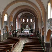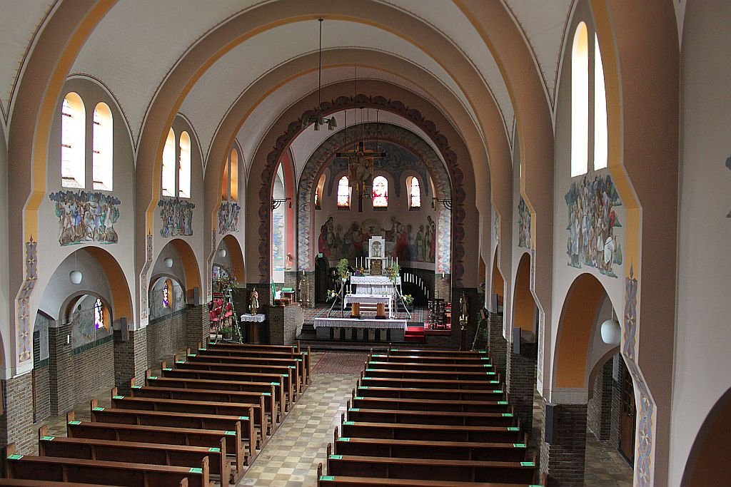 - Muurschilderingen op scheibogen, orgeltribune, koor en trimfboog