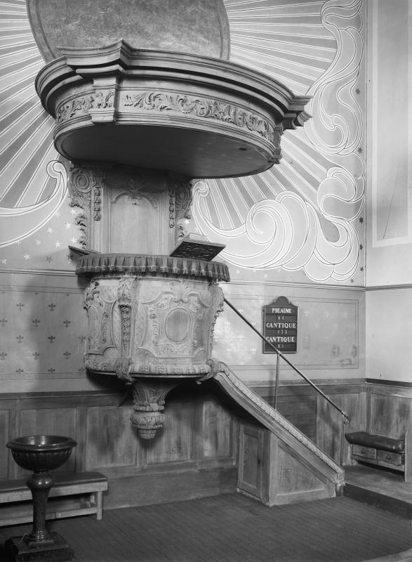 - Op een foto van 1911 (Beeldbank RCE) is een decoratieve muurschildering te zien. Een lambrisering met Franse lelies en golvende stralen achter de preekstoel. Niet meer bestaand.