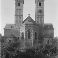 Schip mogelijk oorsprong 11de eeuw; transept 12de eeuw; koor en torens rond 1200; rond 1680 herstelwerkzaamheden; 1949-1951 reconstructie onder leiding van A.J.N. Boosten