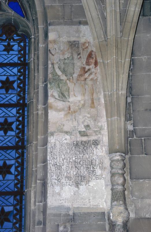 Twee mansfiguren in laatmiddeleeuws of renaissance gewaad, staande op een tegelvloer. Daaronder een geschilderde tekst van het ‘Pater Noster’ . De tekst is door de dagkant van het venster oversneden, waaruit blijkt, dat het koor oorspronkelijk kleinere vensters heeft gehad. Er zijn twee teksten, over elkaar heen geschilderd.
