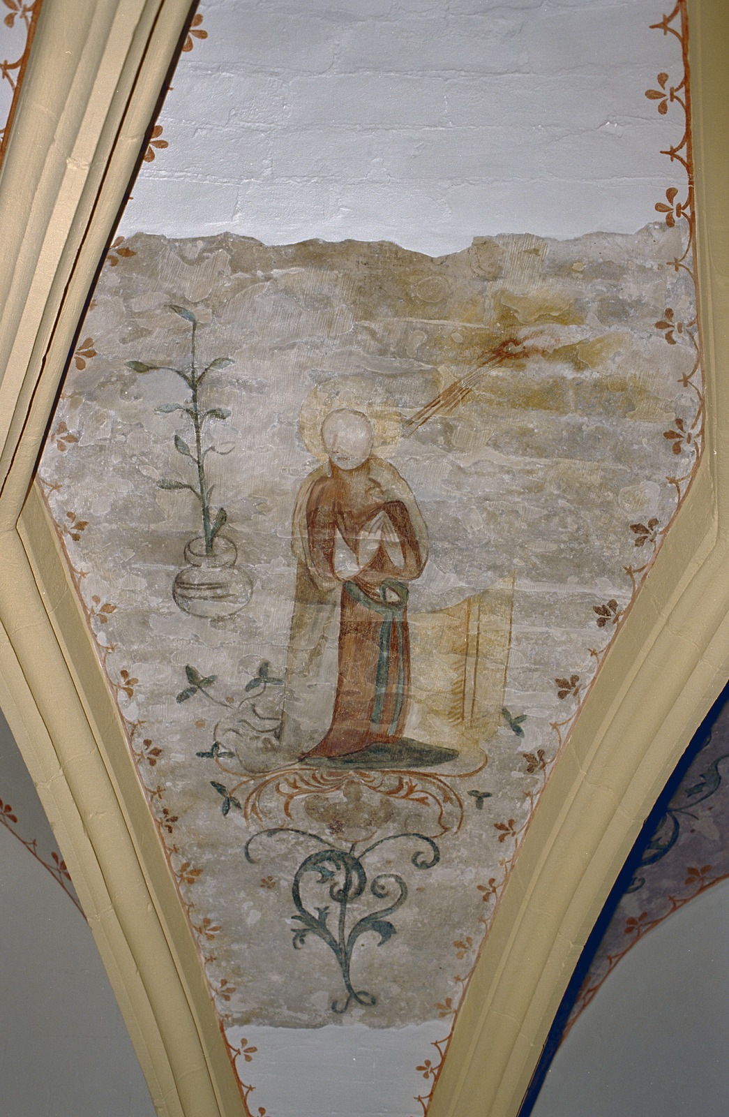 - Geknielde Maria uit een Annunciatie, waarvan de bijbehorende engel Gabriël die op het links aansluitende gewelfveld moet hebben bevonden, verloren is gegaan.