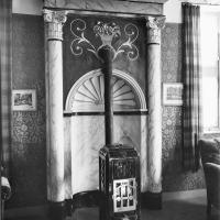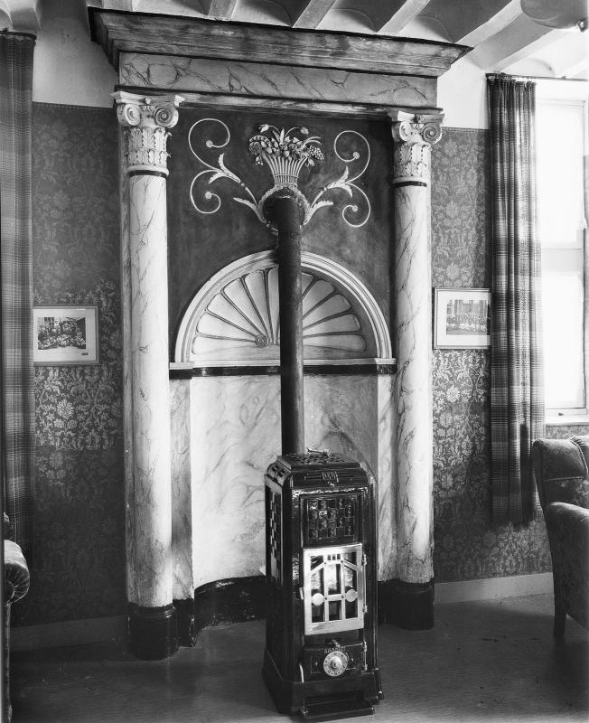 Inwendige nisschouw met beschildering, schelpversiering en flankerende composietpilasters, waartussen boven de nis een bloemenvaas in stucreliëf.