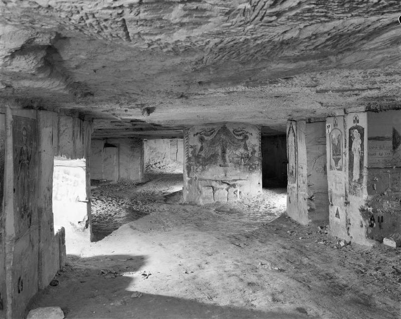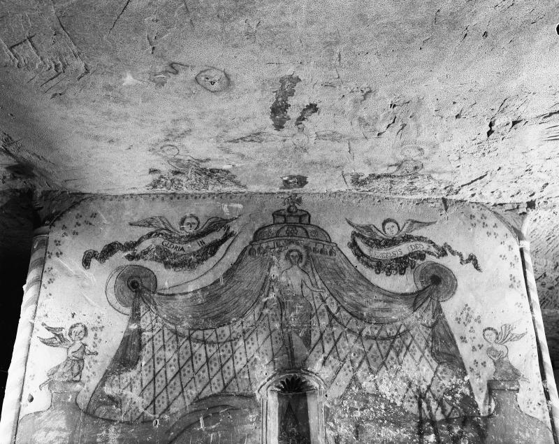 - Boven altaar en op wanden muurschilderingen en -tekeningen