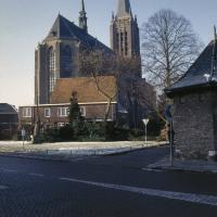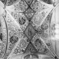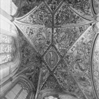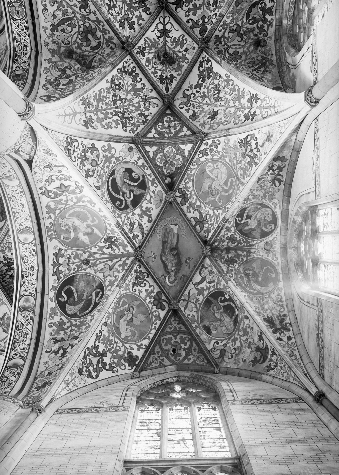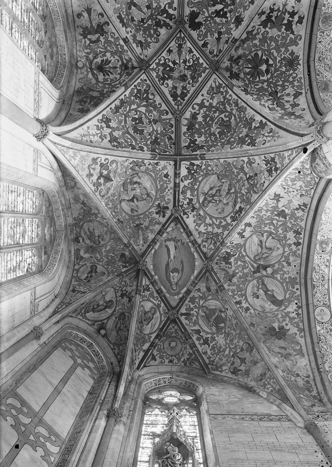 "De 16de-eeuwse schilderingen waren overgepleisterd; zij werden in 1874 gerestaureerd en daarbij eigenlijk geheel vernieuwd naar overgebleven sporen. Ranken van gestileerd bladwerk in bonte kleuren op lichte grond, soms gloopvormen, vullen de gewelfvelden geheel, of omvatten figuurlijke voorstellingen, als bv. in het middenkoor de borstbeelden van Jezus, van Maria, van engelen, van heiligen; enige bevatten wapenschilden. De figuren van O.L. Vrouw in de laatste noordbeuktravee, en van de H. Oda in de laatste zuidbeuktravee zijn o.a. geheel nieuw en ondersteboven geplaatst. ”