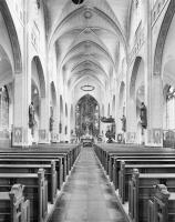 Decoratief programma met figuratieve onderdelenMuurschilderingen in Petrus en Paulus, Leidschendam ; RCE-MoL: De op doek geschilderde kruiswegstaties en de muurschilderingen van de H. Familie, de apostelen, Latijnse en Griekse kerkvaders en stichters en stichteressen van kloosters in de nissen van het schijntriforium zijn zeer vroege werken van de kunstschilder J. Dunselman uit Amsterdam. | datering niet gemotiveerd.