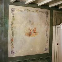 Molen, boom, huis, muur en twee personen Muurschildering in de serre, een boom en een molen is afgebeeld op de wand met ramen en een muurschildering aangrenzend, afgebeeld is een huis, muur en twee personen. Beschadigingen. -