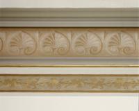 Fragment decoratieve lambriseringsband "De lambriseringsband is ongeveer 27 cm hoog en bestaat uit twee okergele banden van 3,5 à 4 centimeter met daartussen een lichtgele ondergrond met daarop figuratieve afbeeldingen van militairen die in optocht voor de kijker van rechts naar links lopen. In totaal zijn tien (posities van) figuren van ongeveer 16 cm hoog zichtbaar waarvan de eerste drie en de laatste twee figuren zo beschadigd zijn dat ze nauwelijks nog te herkennen zijn. Het blijkt te gaan om een herhalend patroon van vijf figuren die met hulp van een sjabloon geschilderd zijn en de voorstelling heeft een vrolijk dan wel ludiek, of licht spottend karakter.” (Wijnen, 2024, p. 10)