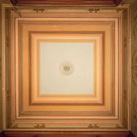Muurschilderingen koor Muurschilderingen, een decoratiepatroon, koor, hoog, op rand onder houten gewelf en tekst op muur. -