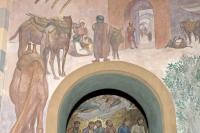 De bekering van Saulus tot Paulus Muurschilderingen in Antonius van Padua/ Cenakelkerk, Heilig Landstichting; De schilder laat in de uitmonstering verschillende sfeerbeelden zien die hij ontleende aan zijn bezoeken aan Palestina en Jordanië. Door de opening zien we een fragment van het mozaïek van het sterfbed van Maria in de aangrenzende kapel [techniek: Keimverf] [staat: Goed] -