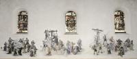 Het monumentale drieluik aan de zuidelijke kant Muurschilderingen in Antonius van Padua/ Cenakelkerk, Heilig Landstichting; Het monumentale drieluik aan de zuidelijke kant met het linker- en het middenpaneel toont een subtiel spel met het scheiden en binden van de panelen door architectuurfragmenten, doorkijkjes en groepen figuranten. Bijzonder is het gebruik van verschillende verdwijnpunten. [techniek: Keimverf] [staat: Goed] -
