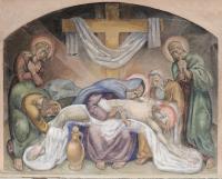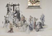 Kruiswegstaties – XIII Jezus wordt van het kruis afgenomen /Bewening van Christus Muurschildering in Lambertus, Maastricht; a. Het exemplaar uit Meuleman (1936) laat door de schaduwrand links zien dat het een schildering betreft op een losse drager die vóór een wand staat of hangt. Anders dan Meuleman stelt, gaat het dus niet om de kruisweg in de Theresiakerk te Maastricht die immers uit muurschilderingen bestaat (zie afb. 52). b. Dezelfde statie als onderdeel van de kruisweg in de Lambertuskerk van Maastricht. [techniek: Fresco] [staat: slecht] -