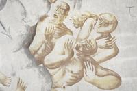 Kruiswegstaties – IX Jezus valt voor de derde maal Muurschildering in Lambertus, Maastricht; Detail in strijklicht van de negende statie van Jan Grégoire in de Lambertuskerkt. In 'Genade van de Steiger', afbeelding 48 verwijzen pijlen naar de grenzen tussen de verschillende dagdelen of giornates. De rode pijl laat een minder geslaagde, iets rommelig bijgewerkte overgang zien. [techniek: Fresco] [staat: slecht] -