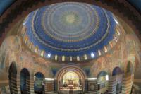 Ornamenten en decoratieve partijen Muurschilderingen in Antonius van Padua/ Cenakelkerk, Heilig Landstichting; Ornamenten en decoratieve partijen in de Cenakelkerk: a. De koepel van de centraalbouw. b-c. De onderste twee en middelste drie sferen van de koepel. d. Het Egyptische plantmotief, met de engel en het Christusmonogram. e. De doorgang met de twaalf apostelen als schapen rondom het Lam Gods in de koortravee. [techniek: Keimverf] [staat: Goed] -