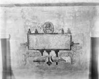 1 architectuurpolychromie met baksteenimitatie, vlechtwerkpatronen en geometrische motieven 1 architectuurpolychromie met baksteenimitatie, vlechtwerkpatronen en geometrische motieven schetslijnen ingekrast, baksteenimitatie op de wanden deels rechtstreeks met verf aangebracht. -
